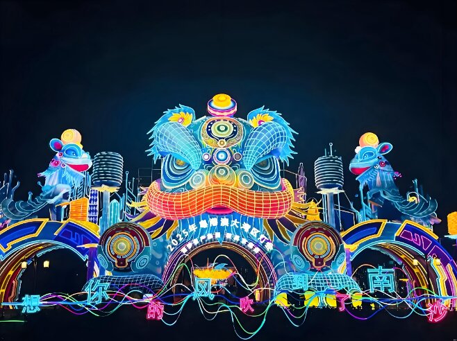 這個(gè)園區(qū)用賽博朋克風(fēng)格引領(lǐng)科幻與傳統(tǒng)新風(fēng)潮,打造了時(shí)尚潮玩世界和年輕人的二次元虛擬世界。燈組“齊天大圣”以金屬線條勾勒輪廓,金箍、火眼金睛、如意金箍棒等細(xì)節(jié)栩栩如生。在燈會(huì)2號(hào)門附近,“賽博醒獅”以超大型天穹式大門組燈的形式,將傳統(tǒng)舞獅與現(xiàn)代科技、未來主義朋克風(fēng)格相融合,彰顯出大灣區(qū)的創(chuàng)新活力。